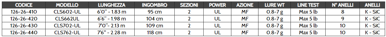 Maneggevolezza, versatilità, eleganza nei dettagli per una serie destinata ad un pubblico giovane, che pratica tecniche diverse per non smettere mai di divertirsi. Con le Cloud si spazia dalle esche siliconiche presentate su jig head agli spoon, fino ai minnow di peso fino a 7-8 grammi: siamo nella sfera del Light Game, qualcosa di molto eccitante nell’ambito dello Street Fishing, ma anche nelle acque tradizionali. Infatti, il cappotto è quasi impossibile, ma non è raro l’incontro con il pesce importante: Lucioperca, Aspio, Siluro di taglia “umana”. Splendida l’impugnatura, sdoppiata in EVA e sughero, con portamulinello anatomico collocato relativamente alto.